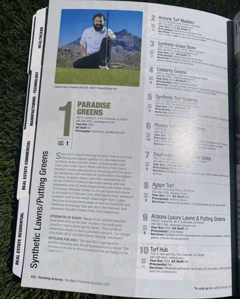We’ve been named #1 in Synthetic Lawns/Putting Greens for the fourth year in a row! Ranking Arizona: The Best of Arizona Businesses produces a list every year of the top-rated Arizona businesses based on votes from customers. It’s a great resource for finding the best businesses and contractors and we highly recommend you pick up a copy if you’re looking for top-of-the-line local companies with high customer satisfaction. Thank you so much to all the businesses and homeowners who loved our service so much they took time out to vote for us.