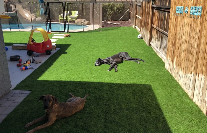 SYNLawn synthetic turf products feature HeatBlock Technology, a proprietary innovation that helps reduce surface temperatures by reflecting more sunlight, particularly infrared rays, instead of absorbing them. This allows the artificial pet turf we install to stay noticeably cooler than many other synthetic options. While any surface will warm in direct Arizona sun, HeatBlock helps ensure pets remain more comfortable during longer play sessions.